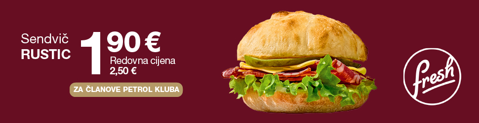 Probajte novi sendvič Rustic – idealan spoj klasičnih okusa i rustikalnog šarma! Samo za članove Petrol kluba dostupan po posebnoj cijeni od 1,90 € (redovna cijena 2,50 €).